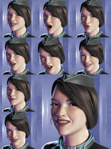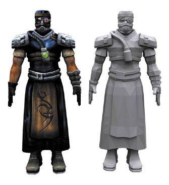Was die technischen Entwicklungs- und Performance-Vorgaben betrifft, unterscheiden sich Echtzeit-Charaktere nur marginal voneinander, d.h. lediglich im Hinblick auf ihre Anwendung: zum einen Live Performances mittels Motion-Capturing und zum anderen interaktive Applikationen wie z. B. Computerspiele. Jedoch gilt Folgendes für beide in gleicher Weise: So viele Details wie möglich über die Textur vortäuschen und so wenige Details wie möglich in das 3D-Objekt integrieren. Aufgrund dieser starken Merkmalsübereinstimmung im Aufbau lassen sich Echtzeit-Digitale in ihrer Anwendung relativ fl exibel wandeln. Ein magnetisches Motion-Capture-System, wie ich es aus “Moderations”-Projekten kenne, stemmt beispielsweise problemlos 20.000 Polygone und 512er Texture-Pages in Echtzeit. Das Herzstück der prominentesten interaktiven Anwendung, nämlich des Computerspiels, ist die Game-Engine. Ihre Limitationen ergeben sich aus dem Zusammenspiel von Prozessor, Grafikkarte und verwendeter Engine, die wiederum von der Anzahl der zu berechnenden Polygone, Texturgröße, Features und Effekten belastet wird. Der einzige Unterschied zwischen PC und Konsole liegt darin, dass die technischen Spezifi kationen für Konsolen bekannt sind, wohingegen der PC einen High-/Low-End-Bereich abdecken muss. Da sich Leistungsfähigkeit und Eigenschaften verschiedener Engines stark voneinander unterscheiden, sind Produktionsvorgaben an den jeweiligen Typus gebunden. Im Falle des Egoshooter “Y-Project” von Westka Interactive kam die Unreal-Warfare-Engine zum Einsatz. Die technischen Vorgaben für Hauptpersonen lauteten: pro Figur maximal 5000 Polygone, jeweils drei 1024er Texture-Pages (Kopf, Torso und Beine), nach Möglichkeiten auf 512er Pages ausweichen. Deformation über Biped-Physique (rigid, no blending), Verwendung von Motion-Capture-Daten.