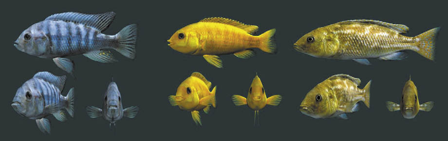 Benötigt wurden also drei verschiedene Fische, von denen eine Art als Schwarm auftreten würde, deren 3D-Modelle und Texturen (2k: 2048 x 1556) closeup-fähig sind und sich darüber hinaus durch ihre Bewegung und Mimik nicht sofort entlarven. Zugegebenermaßen war der Mimik-Aspekt einfach zu bewältigen, da lediglich hektische Augen- sowie Maul- und Kiemenbewegungen animiert werden mussten. Trotz oben genannter Kriterien mussten die Fische wegen der teilweise sehr langen Szenen vom Animationsaufwand im Viewport kontrollierbar bleiben. Die Kennenlern-Szene war mit 1400 Frames, von denen am Ende weniger als die Hälfte verwendet wurde, der mit Abstand längste und arbeitsintensivste Teil des Projektes.