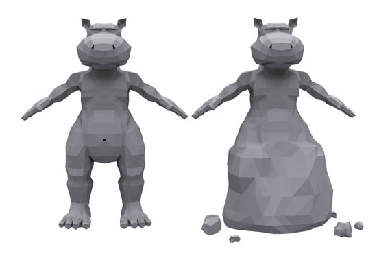 Es stellt sich also die Frage, inwiefern sich die Modellierung eines animierten Charakters von der eines beliebigen statischen Objekts unterscheidet. Auch wenn die eingesetzten Techniken natürlich die gleichen sind, dient die Verwendung von Detail in der Geometrie nicht nur optisch wahrnehmbaren Aspekten, wie z. B. dem Glätten von Kanten oder der Ausgestaltung von aufwändigen organischen Formen wie etwa einem Ohr. Es erfüllt des Weiteren für das Auge unsichtbare Funktionen, die erst während der Animation zum Tragen kommen.